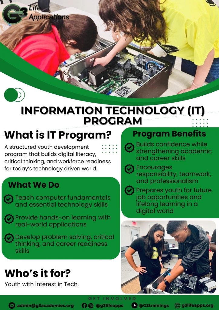 Our IT Program is a structured, youth development experience designed to build digital literacy, problem-solving skills, and workforce readiness in an increasingly technology-driven world.